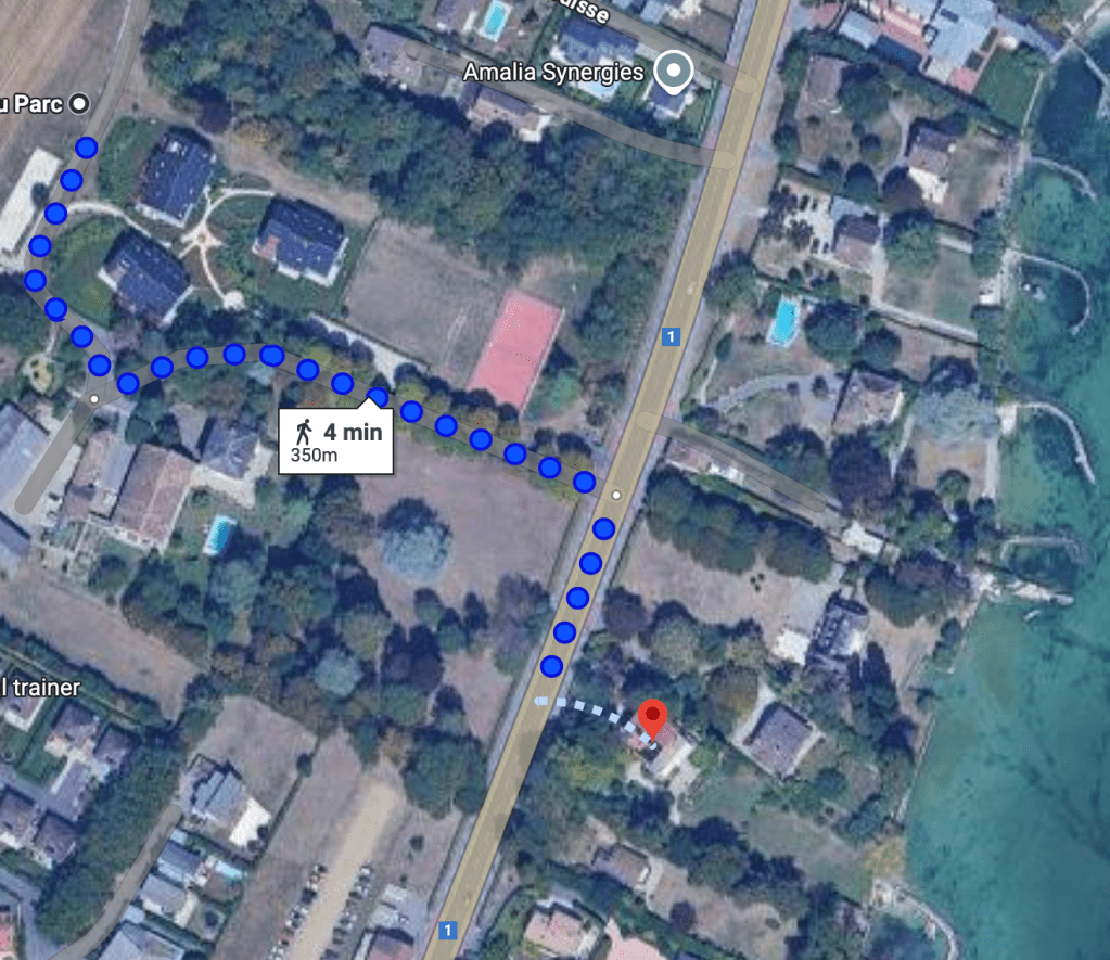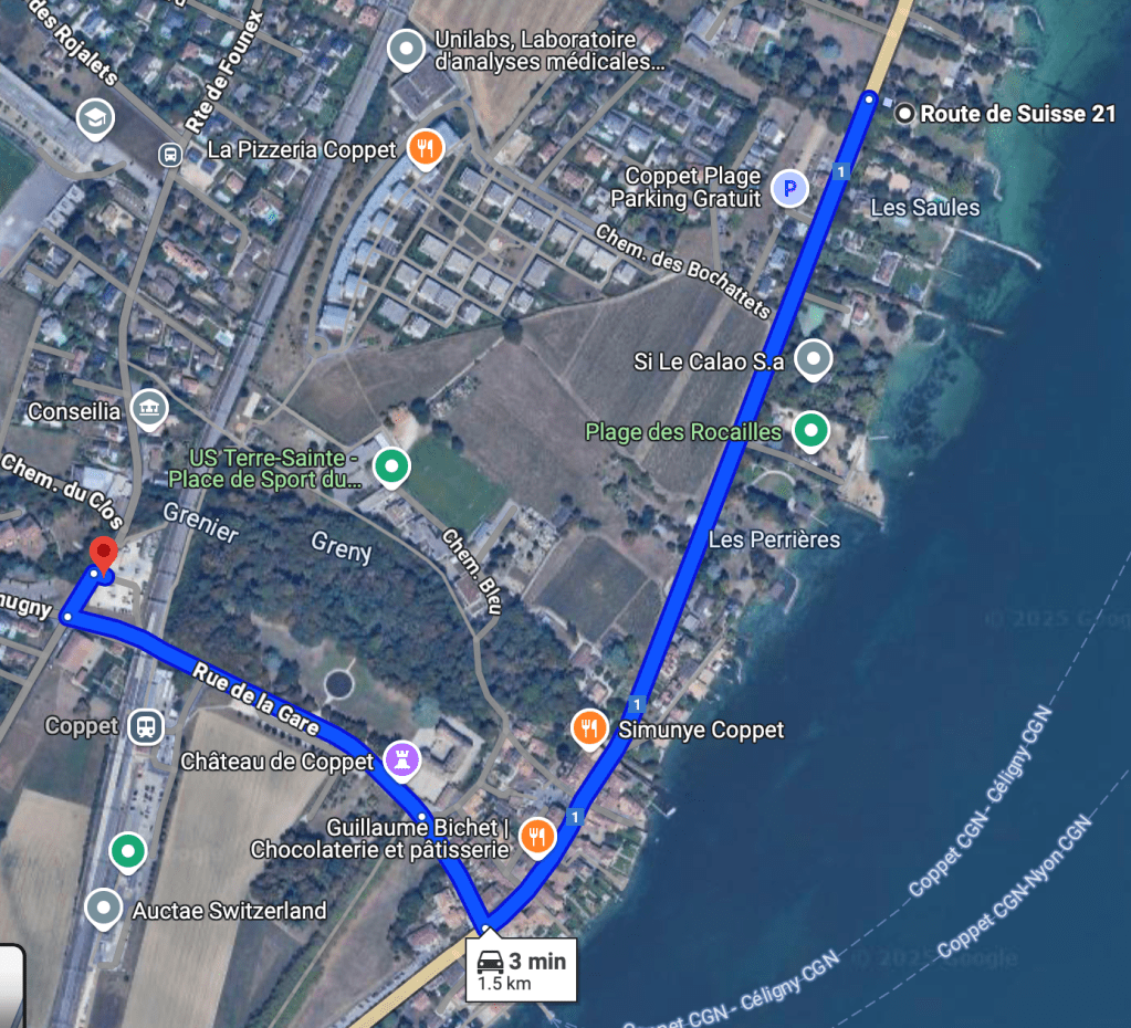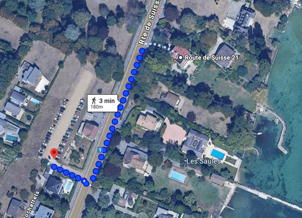 Avant de vous garer, déposez vos passagers au 21 route suisse, 1296 Coppet puis suivez les indications qui vous seront données.